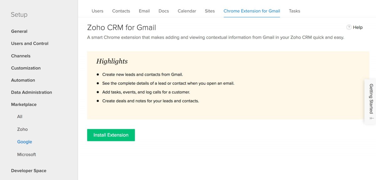 L'extension peut également être facilement installée à partir de votre Zoho CRM. Accédez-le maintenant à votre Zoho CRM.