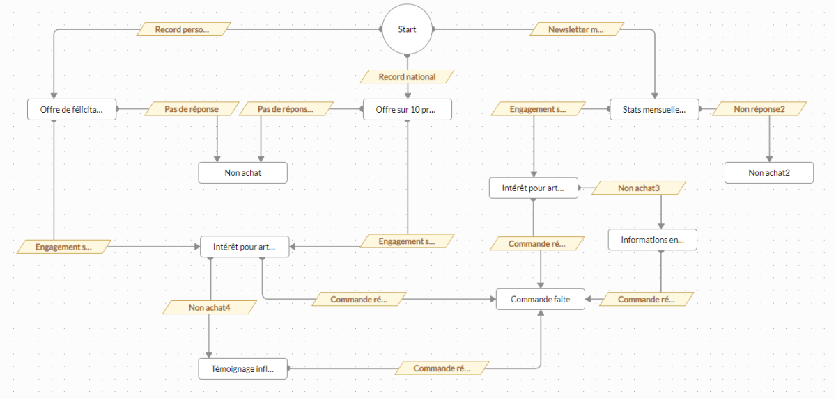 Par exemple, un prospect qui décide d'acheter votre produit recevra un ensemble d'éléments de suivi différent de celui d'une personne qui abandonne des produits dans son panier. Selon qu'ils finissent par acheter ou non, ils peuvent être signalés comme perdus ou impliqués dans d'autres activités de marketing.